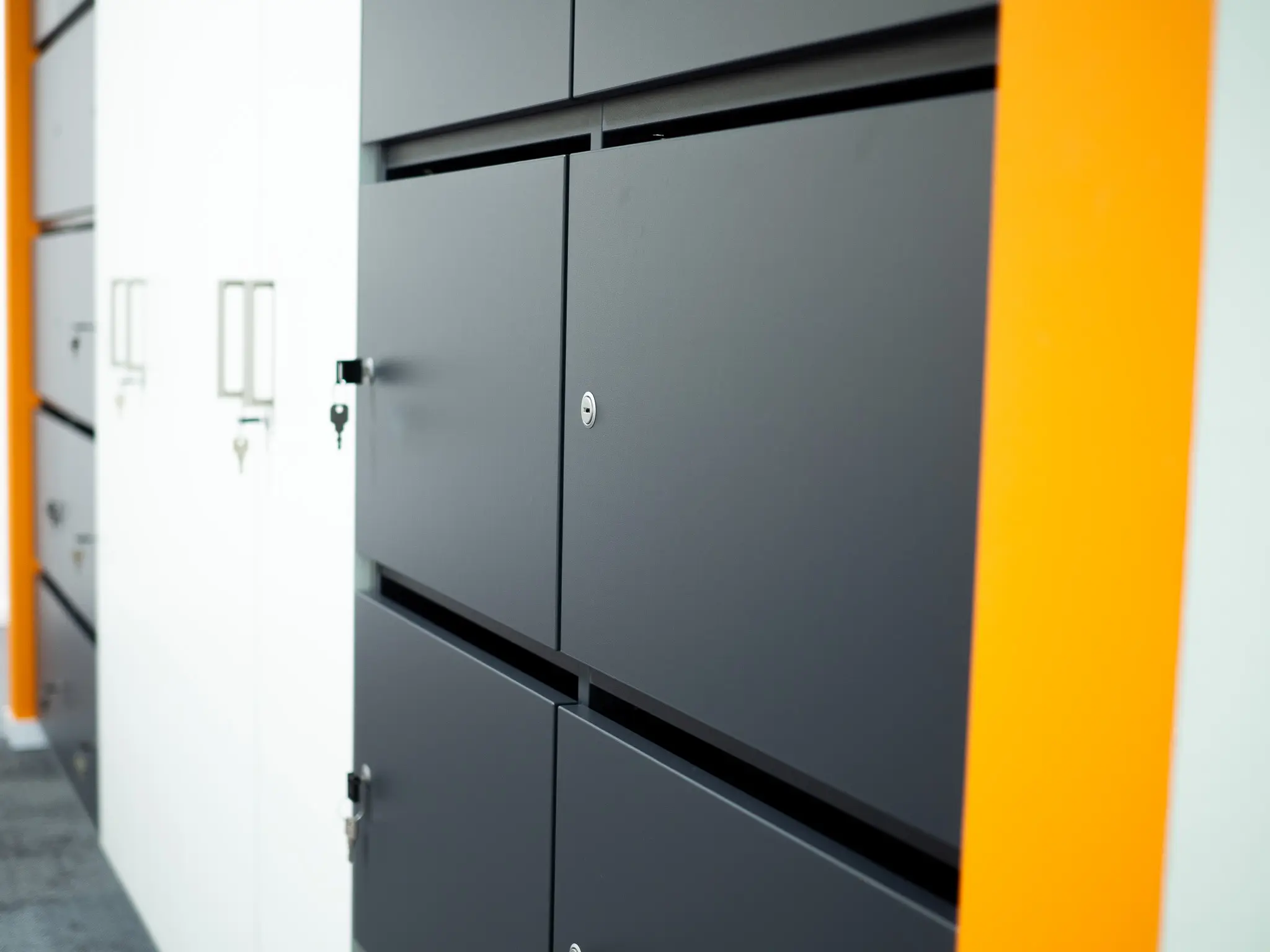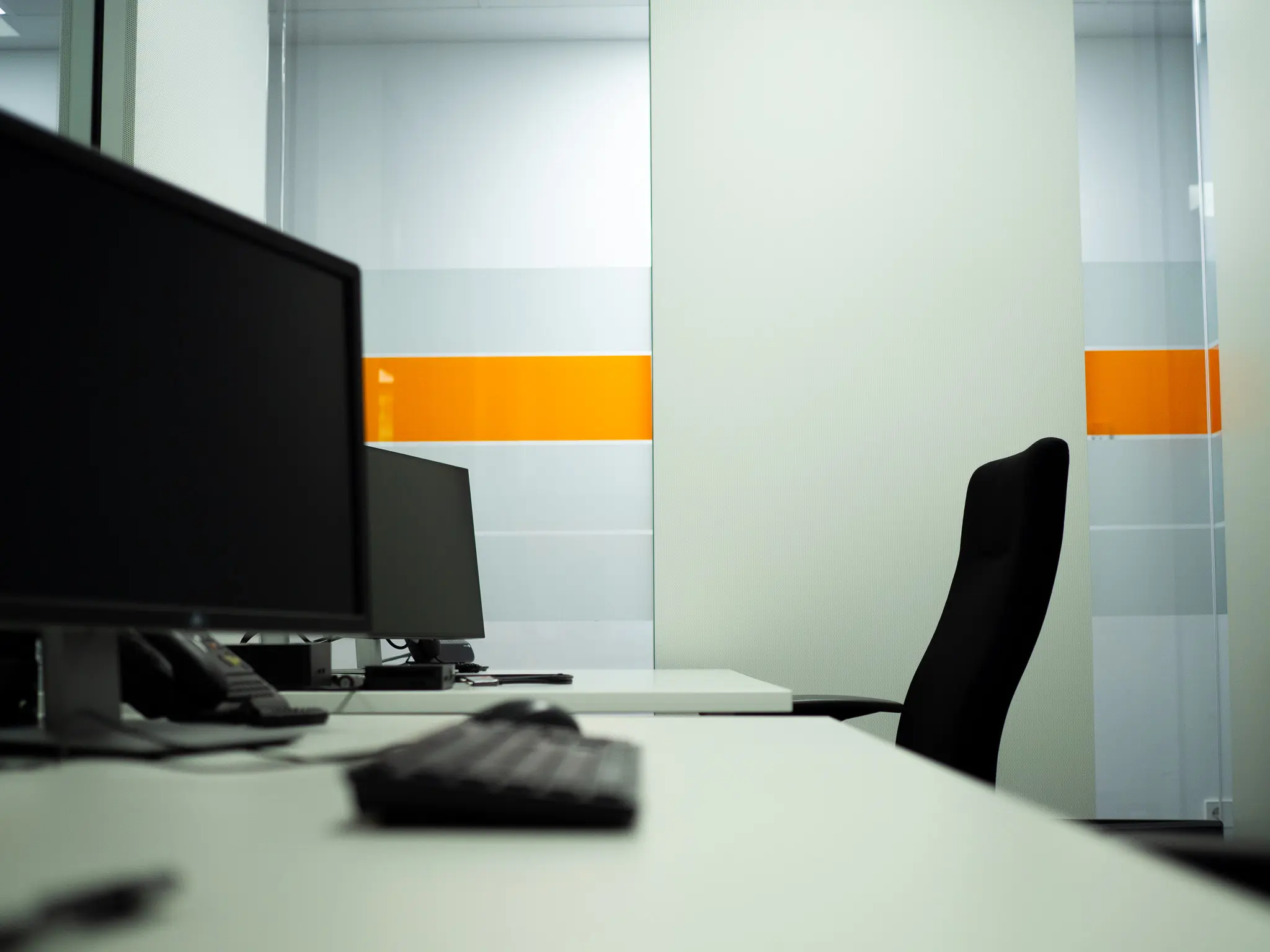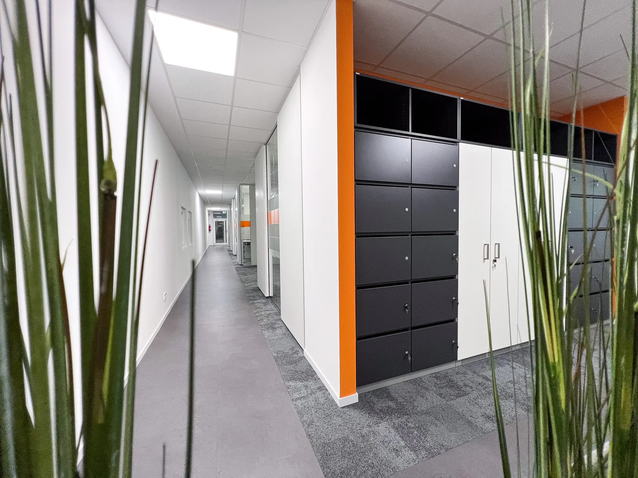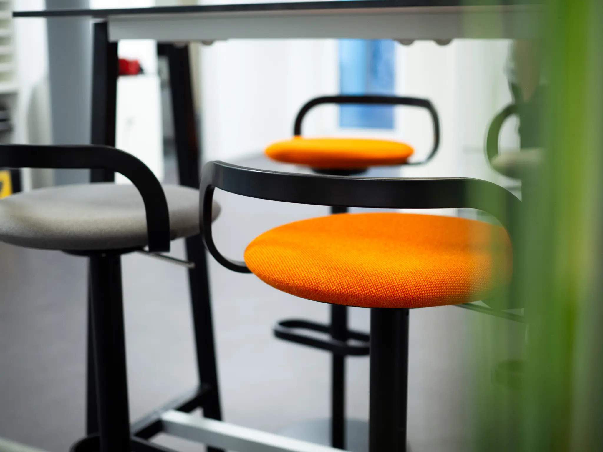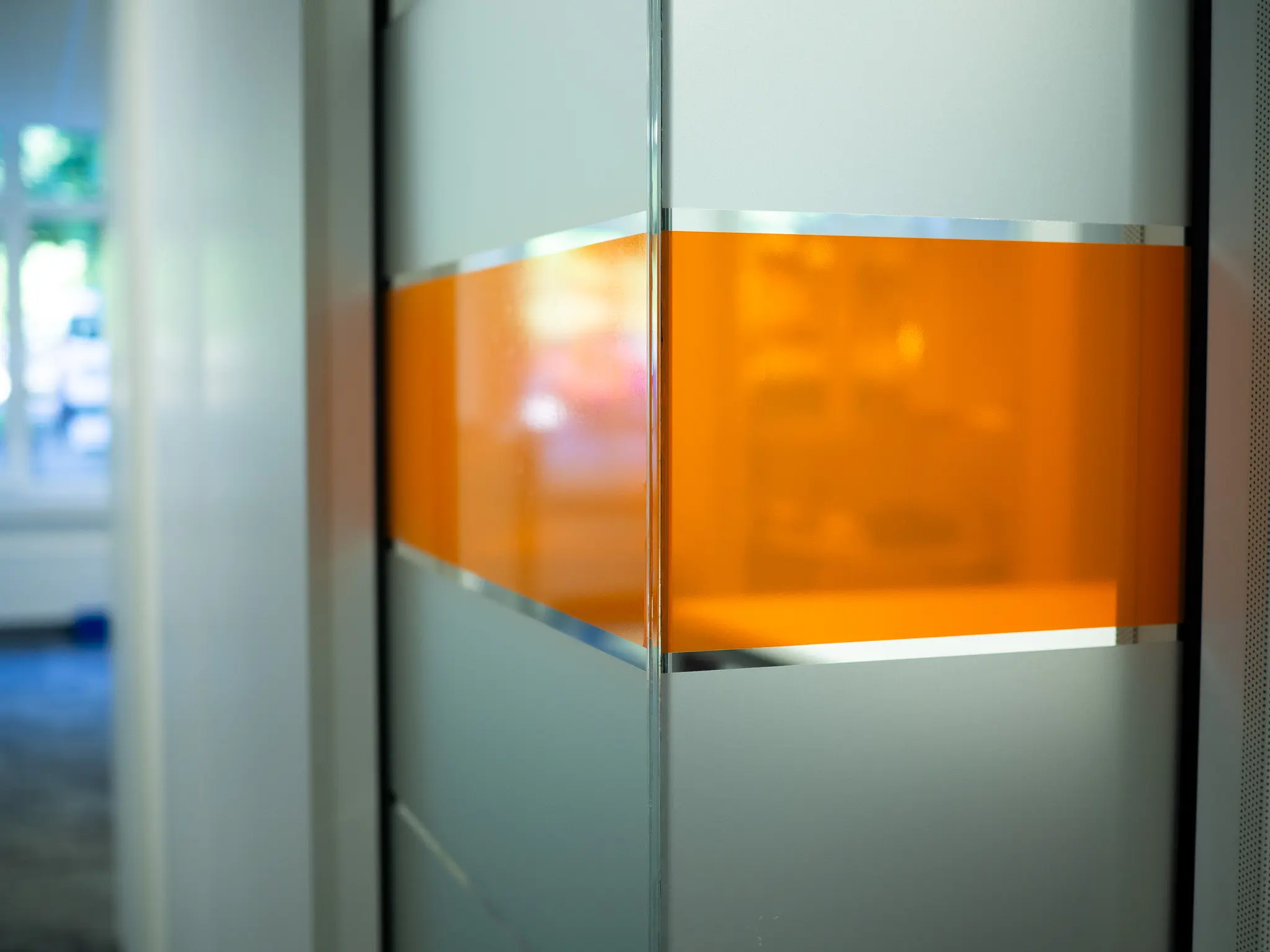 Transparente Glastrennwände gliedern die Fläche, ohne sie zu unterbrechen, während akustisch wirksame Materialien für Ruhe und Konzentration sorgen. Das durchgängige Farbkonzept schafft visuelle Orientierung und trägt zur fokussierten Arbeitsatmosphäre bei – reduziert, aber markant.